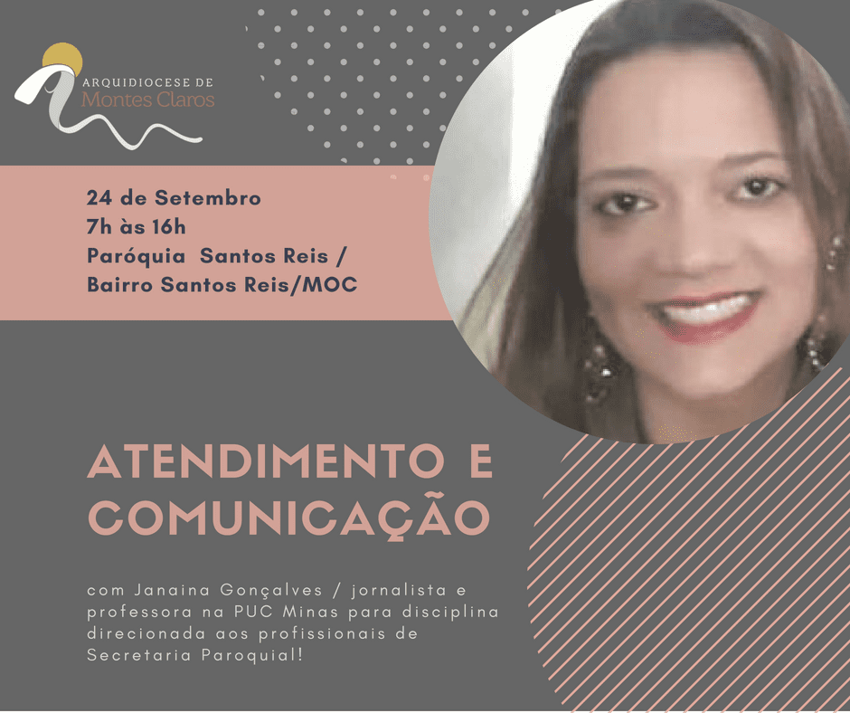 Será no próximo dia 24 de setembro, segunda-feira, o encontro para os profissionais de secretaria paroquial da Arquidiocese de Montes Claros. O evento acontece todos os anos e será assessorado pela Jornalista e professora da Disciplina de Comunicação e Secretaria Paroquial da PUC/Minas, Janaína Gonçalves. Com o tema geral, ATENDIMENTO E COMUNICAÇÃO, os participantes serão […]