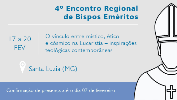 Entre os dias 17 e 20 de fevereiro de 2020, a Comissão Ministérios Ordenados do Regional Leste 2 da CNBB promoverá o 4º Encontro Regional de Bispos Eméritos. O evento ocorrerá no Recanto Coqueiro D’Água, Rua Madre Gertrudes Comensoli, 225, Distrito Industrial Simão da Cunha em Santa Luzia (MG). Os (Arce)bispos Eméritos de Minas Gerais […]
