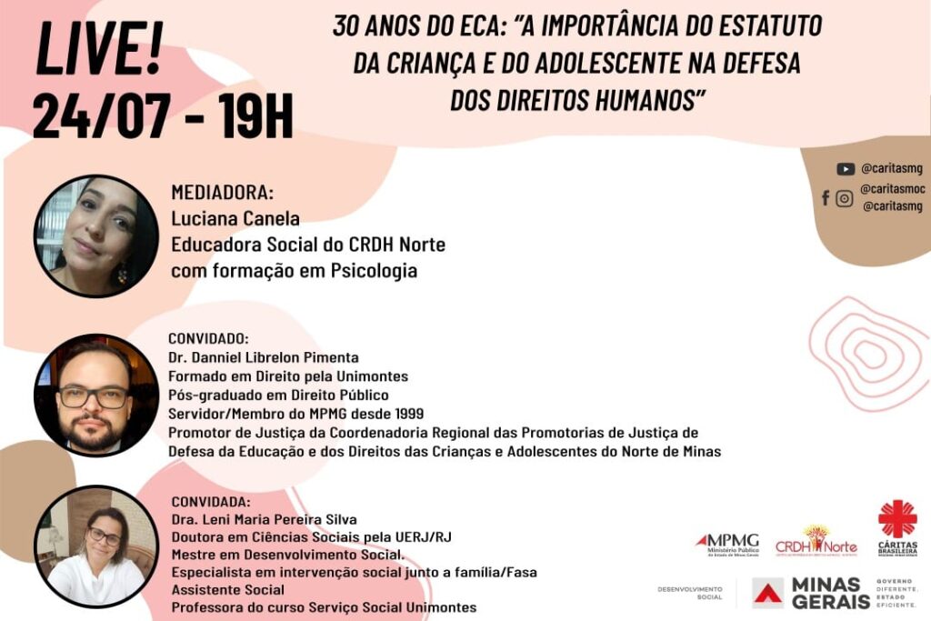 Com o tema “A importância do Estatuto da Criança e do Adolescente na Defesa dos Direitos Humanos”, a Cáritas da Arquidiocese de Montes Claros realizará uma conversa ao vivo no dia 24 de julho, próxima sexta-feira, às 19h. A live é uma comemoração pelos 30 anos do Estatuto da Criança e do Adolescente – ECA, […]