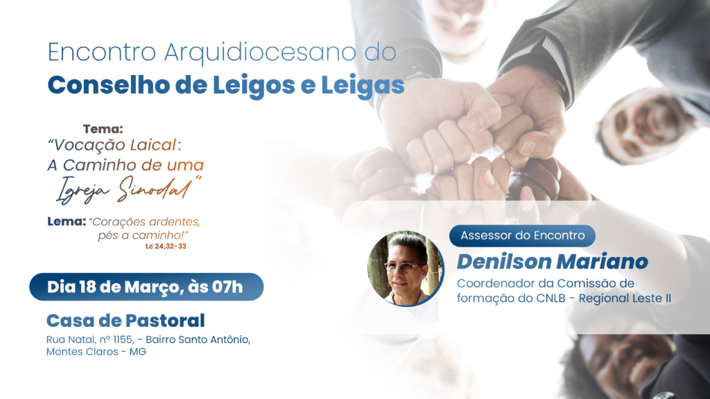 No dia 18 de março de 2023, a Arquidiocese de Montes Claros realizará o Encontro Arquidiocesano do Laicato, na Casa de Pastoral, com o tema “Vocação laical: a caminho de uma igreja sinodal” e o lema “Corações ardentes, pés a caminho!”. O objetivo é fortalecer a organização do laicato na sua vocação de participar da […]