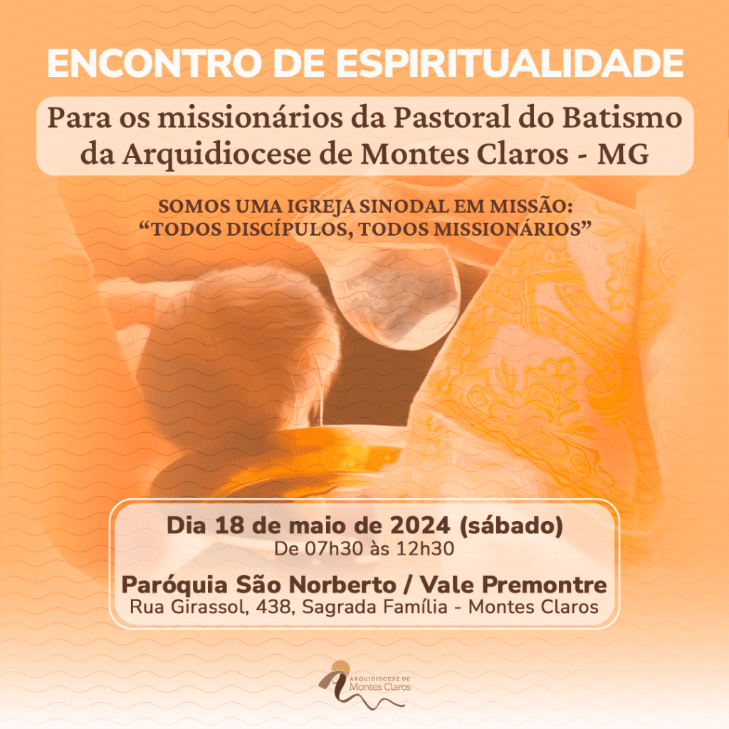 No próximo sábado, dia 18 de maio, a Pastoral do Batismo da Arquidiocese de Montes Claros promoverá um Encontro de Espiritualidade para os missionários da Pastoral do Batismo, com o tema “Somos uma Igreja Sinodal em missão: Todos discípulos todos missionários.” O evento acontecerá na Paróquia São Norberto, localizada na Rua Girassol, 438, no bairro […]