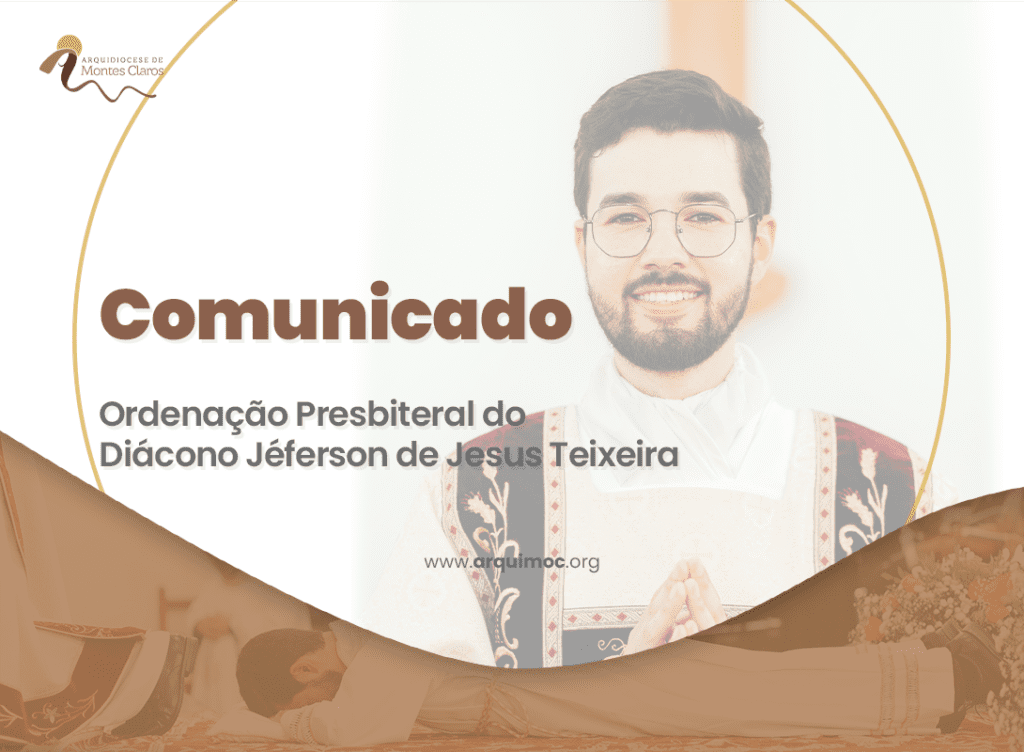 A Arquidiocese de Montes Claros e o Seminário Maior Imaculado Coração de Maria tem a alegria de anunciarem a Ordenação Presbiteral do Diácono Jéferson de Jesus Teixeira. A Solene Celebração Eucarística com Rito de Ordenação Presbiteral ocorrerá no dia 6 de julho, às 9h da manhã, no Santuário Arquidiocesano Senhor do Bonfim, em Bocaiuva/MG. Jéferson […]