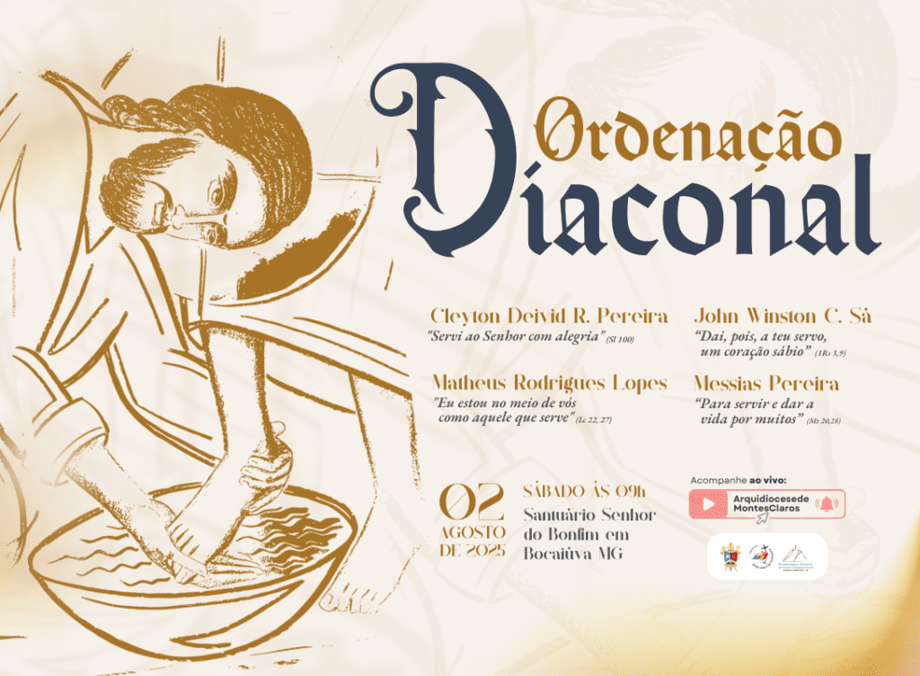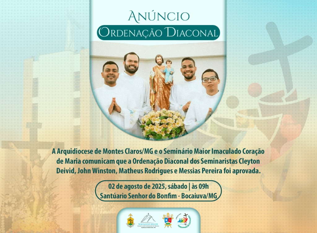 A Arquidiocese de Montes Claros e o Seminário Maior Imaculado Coração de Maria comunicam, com alegria, que foi aprovada a Ordenação Diaconal dos seminaristas Cleyton Deivid Rodrigues Pereira, John Winston Cardoso Sá, Matheus Rodrigues Lopes e Messias Pereira. A celebração será presidida por Dom José Carlos de Souza Campos, arcebispo metropolitano, no dia 2 de […]