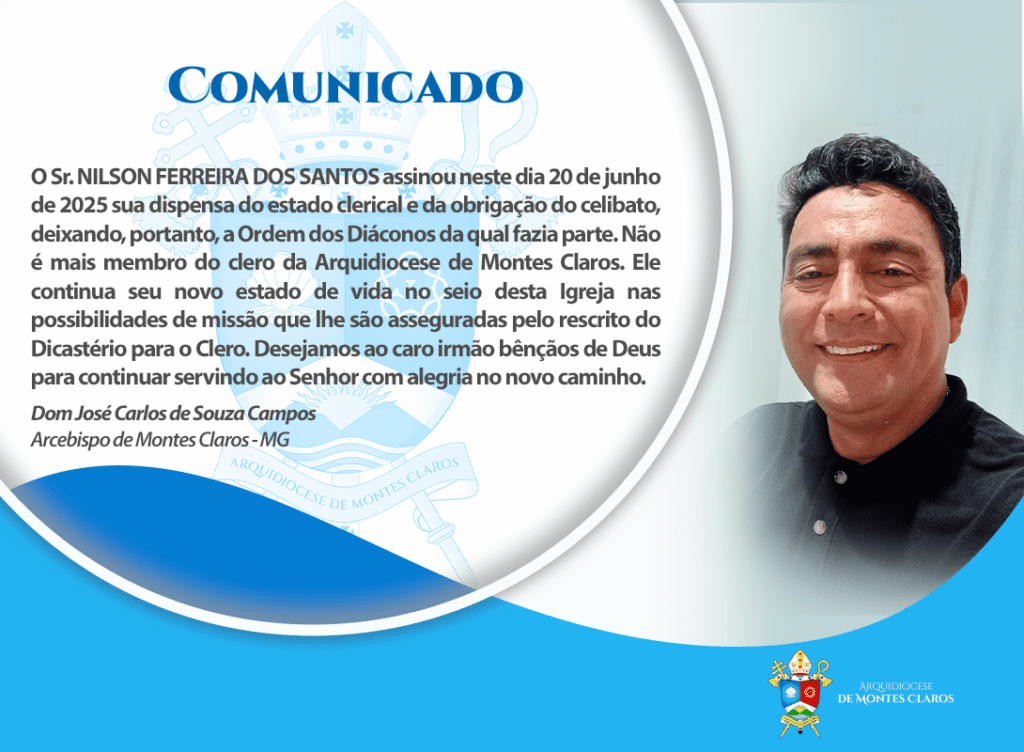 O Sr NILSON FERRERA DOS SANTOS assinou neste dia 20 de junho de 2025 sua dispensa do estado clerical e da obrigação do celibato, deixando, portanto, a Ordem dos Diáconos da qual fazia parte. Não é mais membro do clero da Arquidiocese de Montes Claros. Ele continua seu novo estado de vida no seio desta […]