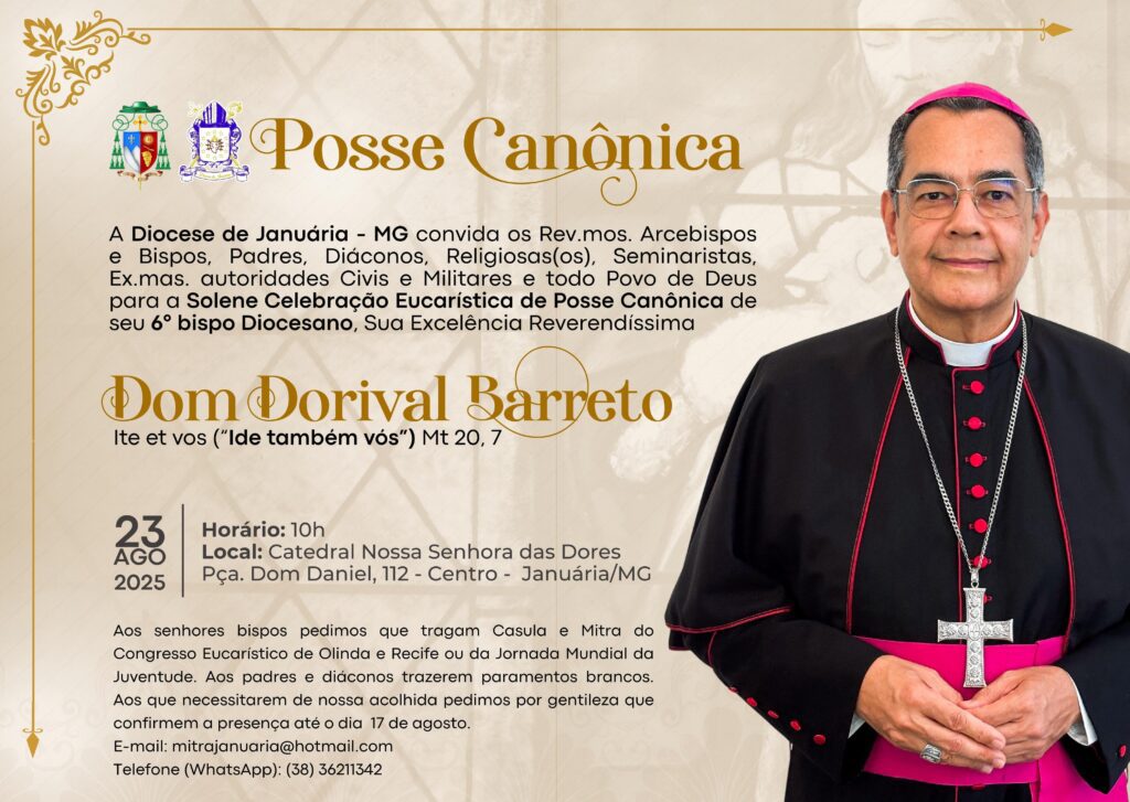Uma nova missão, um mesmo coração: Dom Dorival retorna ao Norte de Minas como pastor. No próximo dia 23 de agosto de 2025, às 10h, será celebrada a Posse Canônica de Dom Dorival Souza Barreto, 6º Bispo Diocesano da Diocese de Januária-MG, em uma Solene Celebração Eucarística na Catedral Nossa Senhora das Dores, localizada na Praça […]