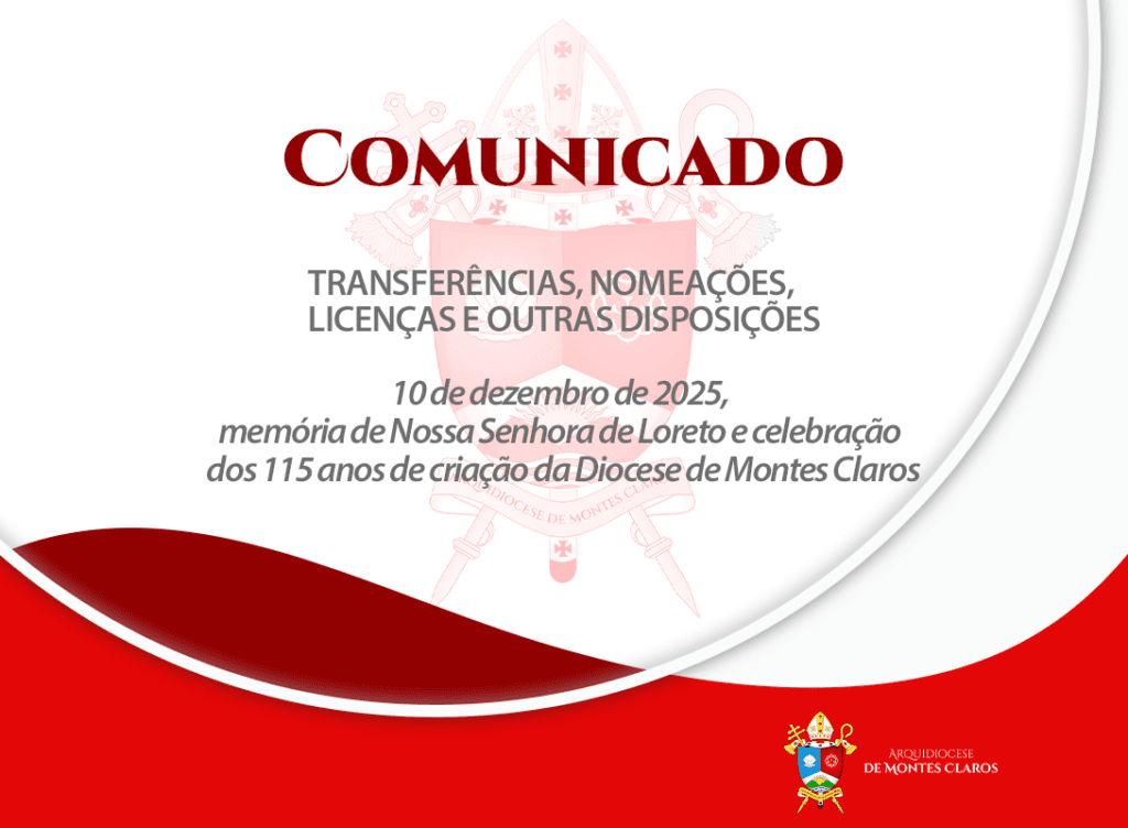 Nesta quarta-feira, 10 de dezembro de 2025, dia em que a Diocese de Montes Claros celebra 115 anos de criação, a Arquidiocese publica o comunicado Transferências 2026 – Parte I, com as primeiras mudanças e nomeações de sacerdotes para o próximo ano. As transferências, definidas pelo Arcebispo Dom José Carlos em conjunto com o Conselho […]