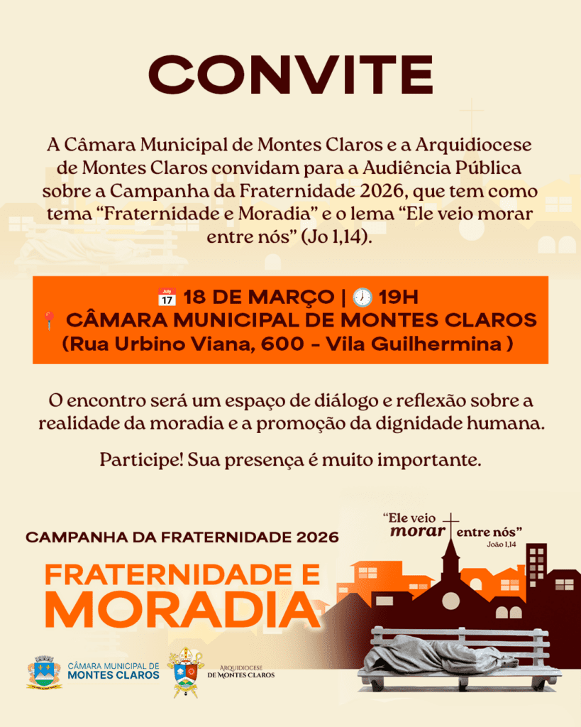 A Arquidiocese de Montes Claros, em parceria com a Câmara Municipal de Montes Claros, realiza nesta quarta-feira, 18 de março, uma Audiência Pública para refletir sobre a Campanha da Fraternidade 2026, que neste ano apresenta o tema “Fraternidade e Moradia” e o lema “Ele veio morar entre nós” (Jo 1,14).