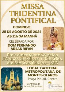 Para celebrar esta data significativa, o Padre Gledson Eduardo de Miranda Assis, capelão da Confraria da Missa Tridentina, com o consentimento de Dom José Carlos, convidou Dom Fernando Arêas Rifan para presidir a Missa Pontifical Tridentina. Além de celebrar a Missa, Dom Rifan passará o final de semana em Montes Claros, visitando a comunidade local.