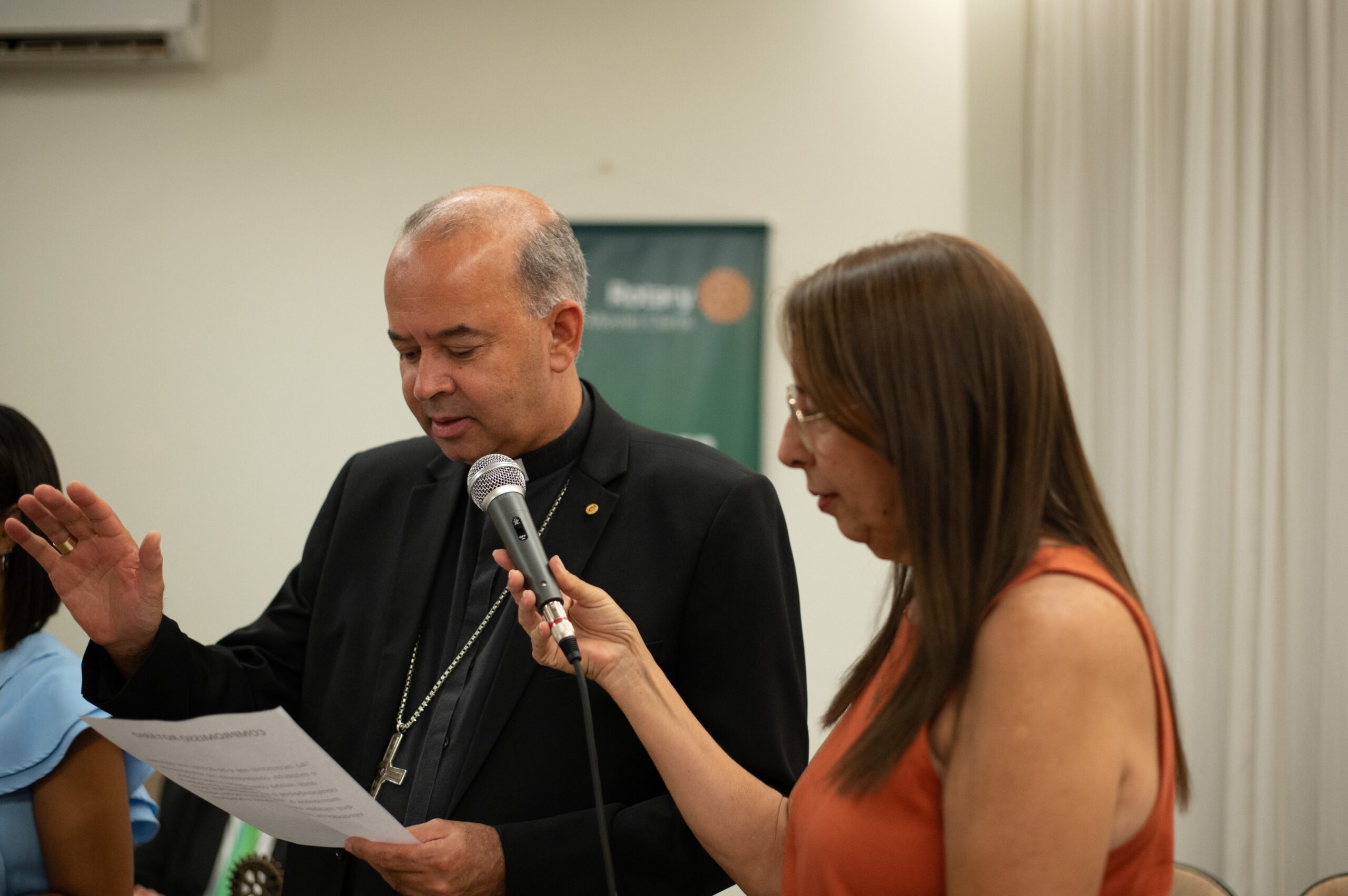 Um dos momentos mais marcantes foi a leitura do Compromisso Rotário, onde Dom José Carlos, de mão direita erguida, comprometeu-se a seguir a Prova Quádrupla — diretriz ética baseada na verdade, justiça, boa vontade e benefício mútuo.