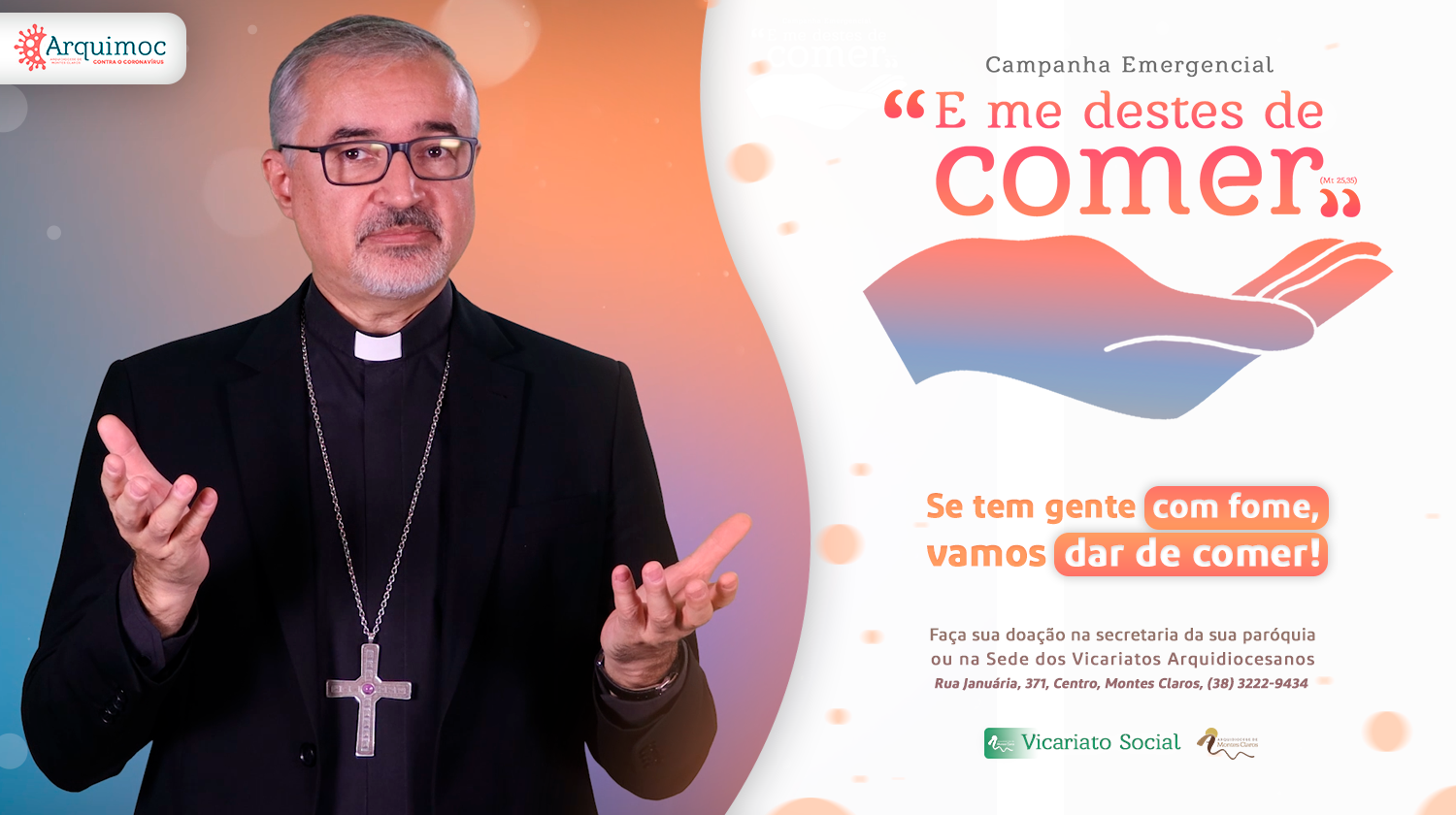Um ano após o primeiro isolamento físico provocado pela pandemia do novo coronavírus, alcançamos a marca de mais de 1 milhão de casos confirmados só em Minas Gerais. Mães, pais, irmãos, irmãs, tios e tias, avós, filhos, amigos, parentes sofrem com a doença. Além das mortes, a pandemia trouxe fome, miséria e violência. Diante deste cenário, a Arquidiocese de Montes Claros, por meio do Vicariato para a Ação Social, propõe a Campanha Emergencial “E me destes de comer” (Mt 25,35). Uma campanha solidária para atender as famílias que mais sofrem com a pandemia. “Se tem gente com fome, vamos dar de comer!”