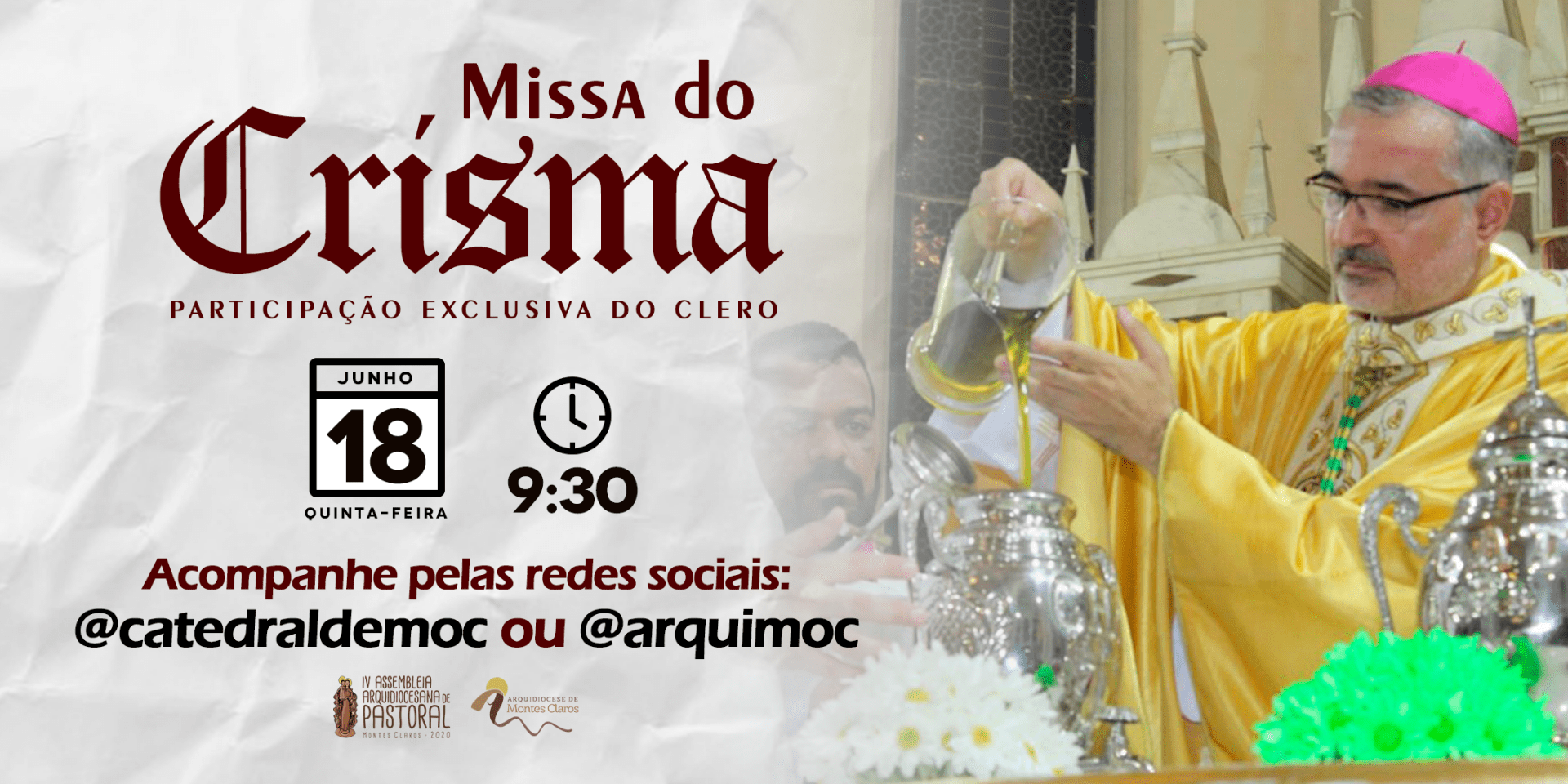 Nesse período de distanciamento social por causa da pandemia do COVID-19, a celebração que tinha data marcada para dia 02 de abril, foi adiada para amanhã. Respeitando o decreto municipal, o número máximo de participantes na Catedral é de 150 pessoas, número preenchido pelo clero e coordenadores de pastorais. Os fiéis são convidados a acompanhar em suas casas por meio das redes sociais da Catedral de Montes Claros ou pelo facebook da Arquidiocese de Montes Claros.