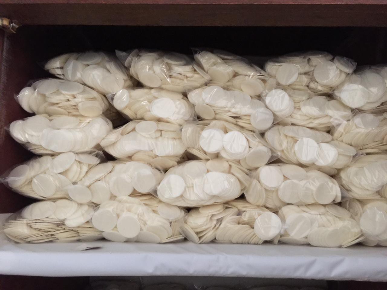 PROCESSO DE FABRICAÇÃO DAS PARTÍCULAS: Elas começam ainda de madrugada. No dia anterior o trigo é peneirado. “Despertamos às 4:45 e colocamos a massa para bater antes de rezarmos Laudes às 5h10. Deixamos bater por aproximadamente 30 minutos e a massa descansa um pouco. O segundo passo é assar as pastas que são colocadas em uma sauna para umedecer. O Processo de assar leva quase toda a parte da manhã, quando fazemos uma quantidade grande. À tarde guardamos as pastas umedecidas e só no dia seguinte é que a cortamos. Encerrado este processo, fazemos a seleção das hóstias antes de empacotar e selar”, explica irmã Maria Letícia, o longo e trabalhoso processo: “Para assar as pastas, o processo é contínuo. Depois temos que aguardar umedecer o suficiente (as vezes guardamos durante a noite, quando fazemos uma quantidade maior que a de costume) porém, só cortamos no dia seguinte.