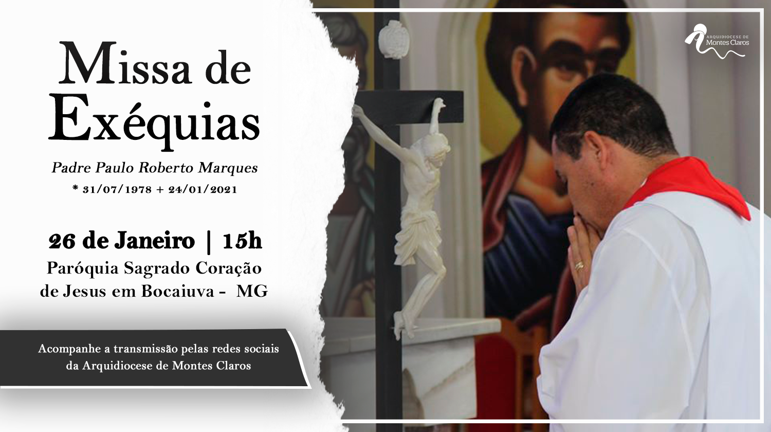 O sepultamento do Padre Paulo Roberto Marques se dará nesta terça-feira (26), em Bocaiuva. O corpo foi liberado pelo IML de Curvelo no início da noite dessa segunda-feira e transladado direto para a Igreja Sagrado Coração de Jesus. Devido as restrições da pandemia do COVID-19 pede-se, insistentemente, que as pessoas que desejarem fazer sua oração junto à urna funerária, o façam sem aglomeração e respeitem as orientações da paróquia. A celebração das exéquias poderá ser acompanhada pelas redes sociais da Arquidiocese de Montes Claros. Presidida por dom João Justino e concelebrada por demais sacerdotes, a celebração será às 15h e em seguida o sepultamento no cemitério local.