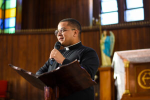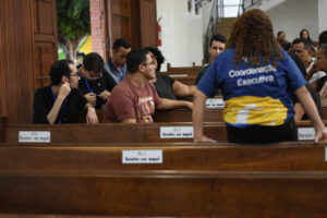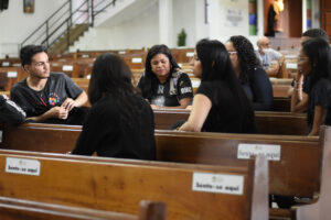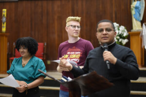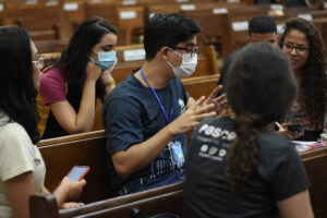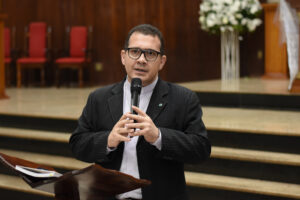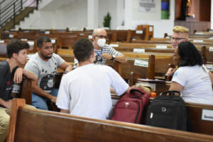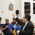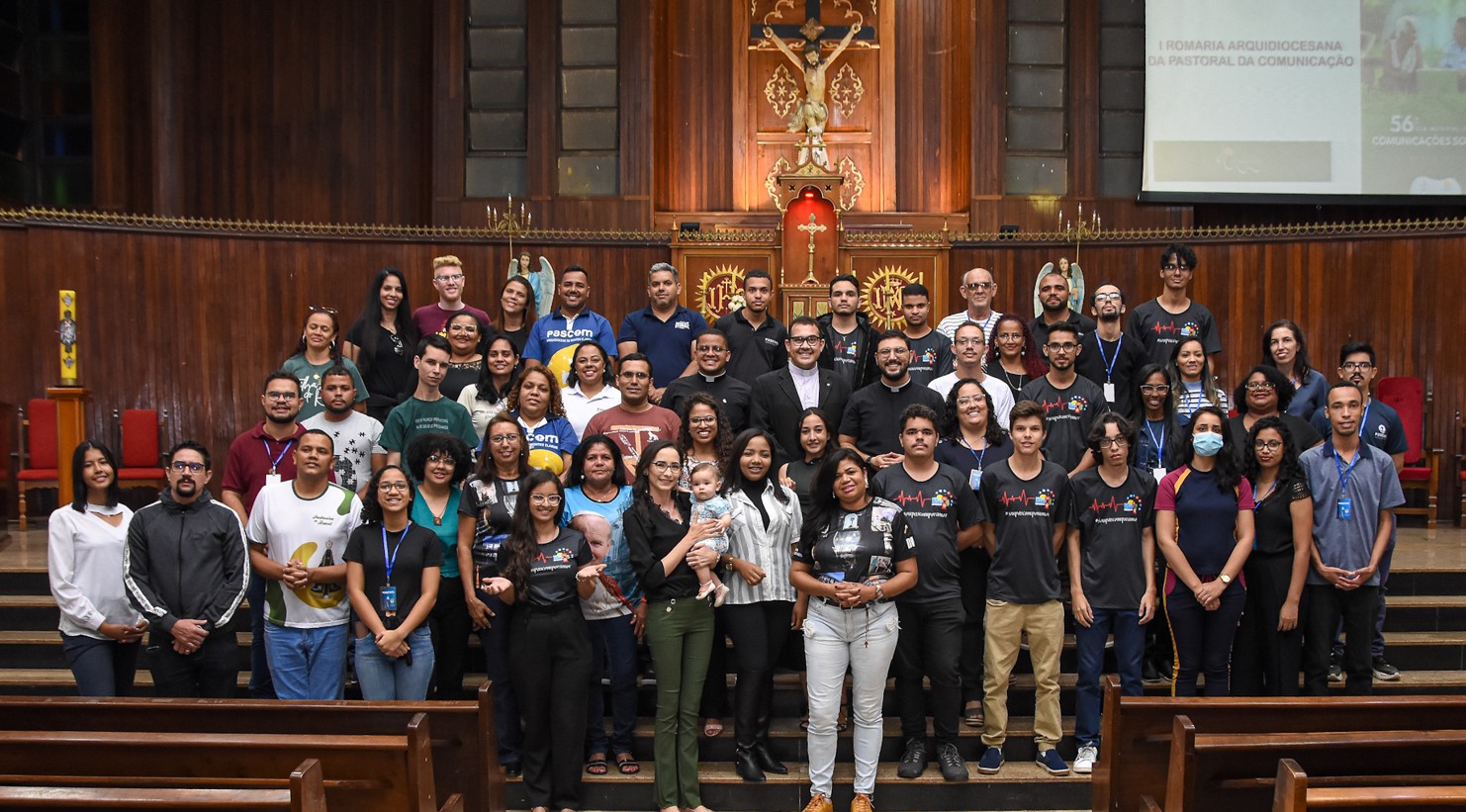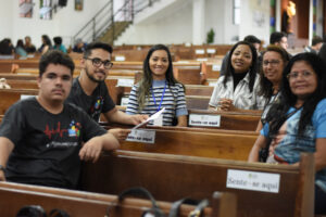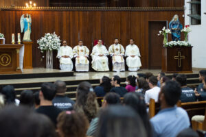 Após a tarde de espiritualidade, os pasconeiros participaram da Missa pelos Comunicadores. A celebração foi presidida pelo pe Genivaldo e estavam presentes o Diácono George e padre Alan Sávio, pároco da Paróquia Senhor do Bonfim e do diácono Eric Jader que colabora também no Santuário.