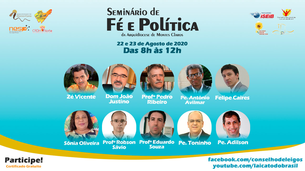 Nos dias 22 e 23 de agosto acontece o Seminário de Fé e Política da Arquidiocese de Montes Claros. O evento on-line e gratuito será transmitido ao vivo pelo You Tube (Clique aqui) e Facebook (Clique aqui) do Conselho Nacional dos Leigos e Leigas do Brasil (CNLB). Serão dois dias de trocas de reflexões e palestras, das 08:00 às 12:00.