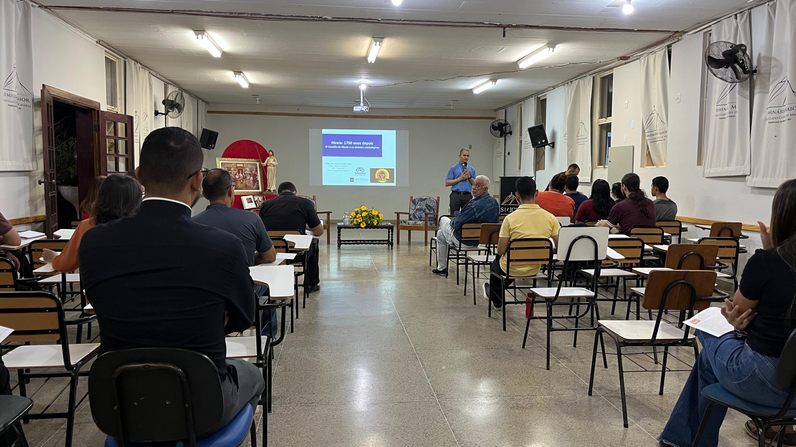 Na noite do dia 2 de junho de 2025, o Seminário Maior Imaculado Coração de Maria, da Arquidiocese de Montes Claros, realizou o Simpósio Interdisciplinar “Niceia: 1700 anos depois – O Concílio e os debates cristológicos”, um momento de profunda reflexão teológica e histórica, promovido pelas disciplinas de História da Igreja Antiga e Patrologia. O evento foi organizado pelo Prof. Dr. Márcio Jean Fialho de Sousa e contou com a participação da Prof.ª Dra. Helena Amália Papa, docente de História Antiga da Universidade Estadual de Montes Claros (UNIMONTES), e recordou o marco da definição da fé cristológica na história da Igreja