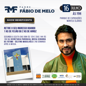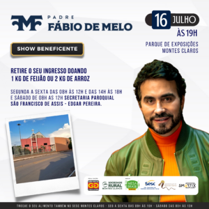 Uma realização da Gêmeos Produções e Sociedade Rural, o show do Padre Fábio de Melo, acontecerá dia 16 de julho, as 19h, no Parque de Exposições José Athayde. A iniciativa está captando doações de alimentos, sendo 1 kg de feijão ou 2 de arroz, que podem ser entregues na unidade do Sesc e em algumas igrejas da Arquidiocese de Montes Claros. Confira abaixo quais são as igrejas.
